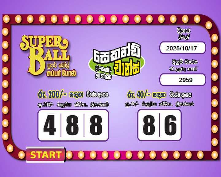 Development Lottery Board Super Ball 17 October 2025 Draw Number 2959 results. Super Ball 17/10/2025 Lottery Results. Super Ball 2025.10.17 Wining Numbers. 2025-10-17 Online Lottery Results